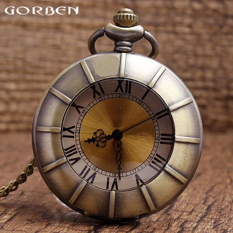 Name: Gorben-reloj con carcasa de cobre Número romano, esfera de cristal, de bolsillo, de cuarzo, transparente, vintage, unisex, con collar de cadena larga