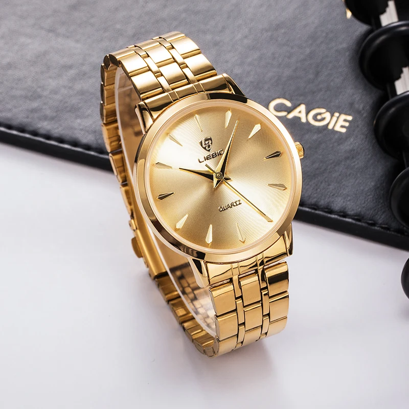 Name: LIEBIG-Reloj de pulsera de cuarzo para hombre y mujer, cronógrafo de acero inoxidable puro, resistente al agua, regalo de enamorados, marca de lujo, pareja dorada